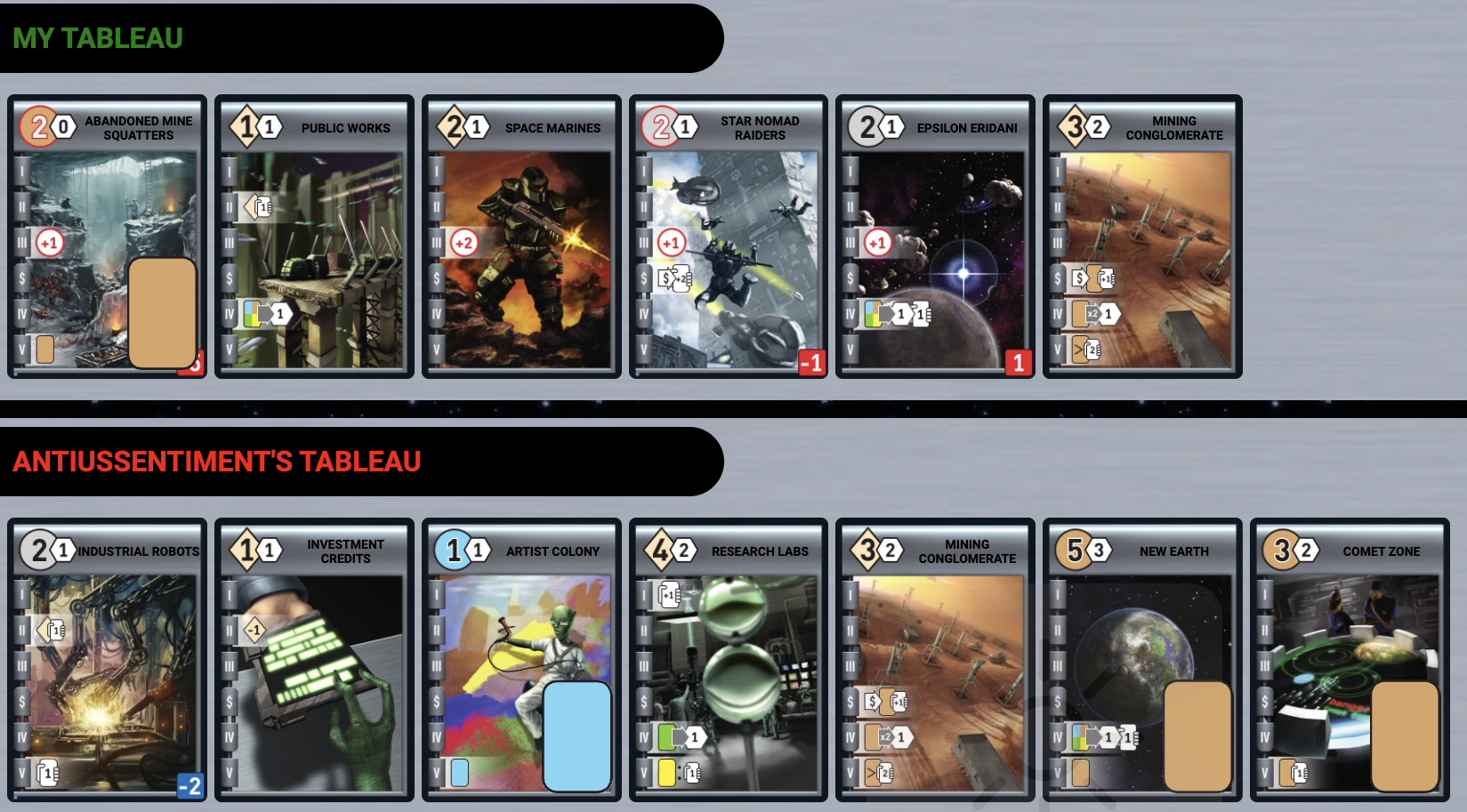 Race for the Galaxy on Board Game Arena: Andrew builds a vibrant economy while I mortgage everything to buy guns and seize production worlds that I don’t know how to run. U-S-A! U-S-A!