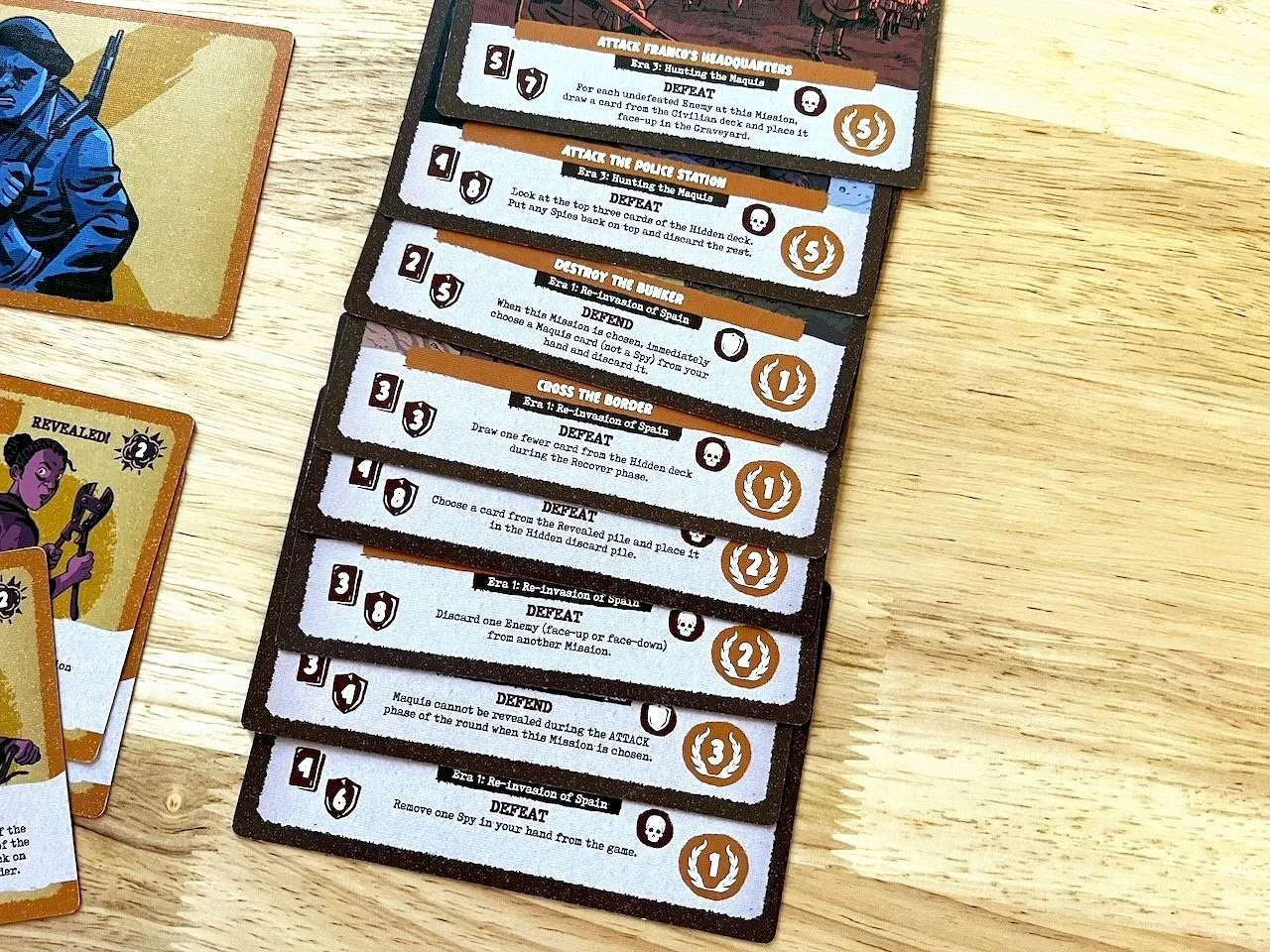 The idea was to be able to take down the first couple missions without having to use any of my crew’s powerful Revealed abilities. Using these abilities can save you from mission failure. Using them also exposes their identities to Franco’s men and removes them from your deck, starting the desperate downward slide that shrinks and shrinks your pool of operatives as the missions get harder. Good solo games always create scarcity, but watching these endearing cartoon insurgents dribble out of play is one of the most anxious flavors of “not enough” that I’ve felt in a long time.